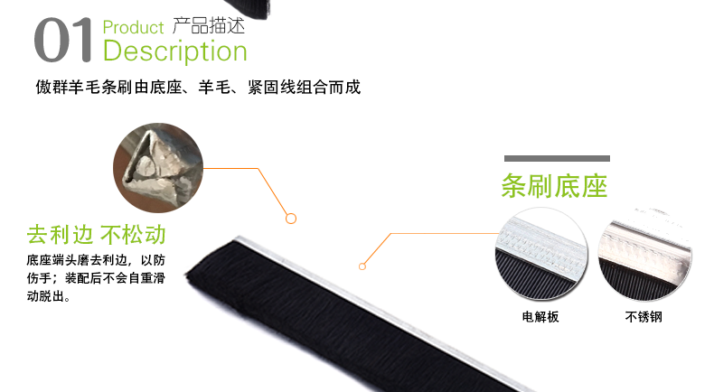 产品简介: 傲群刷业生产的羊毛条刷,采用纯净羊毛,因此其毛丝更加柔软、回复力更好等特点,常应用在机械、线盒、门底、机柜等行业,起到良好的密封防尘、防虫、防夹、隔冷热等作用。更多羊毛条刷详情请咨询 石小姐 13580380003